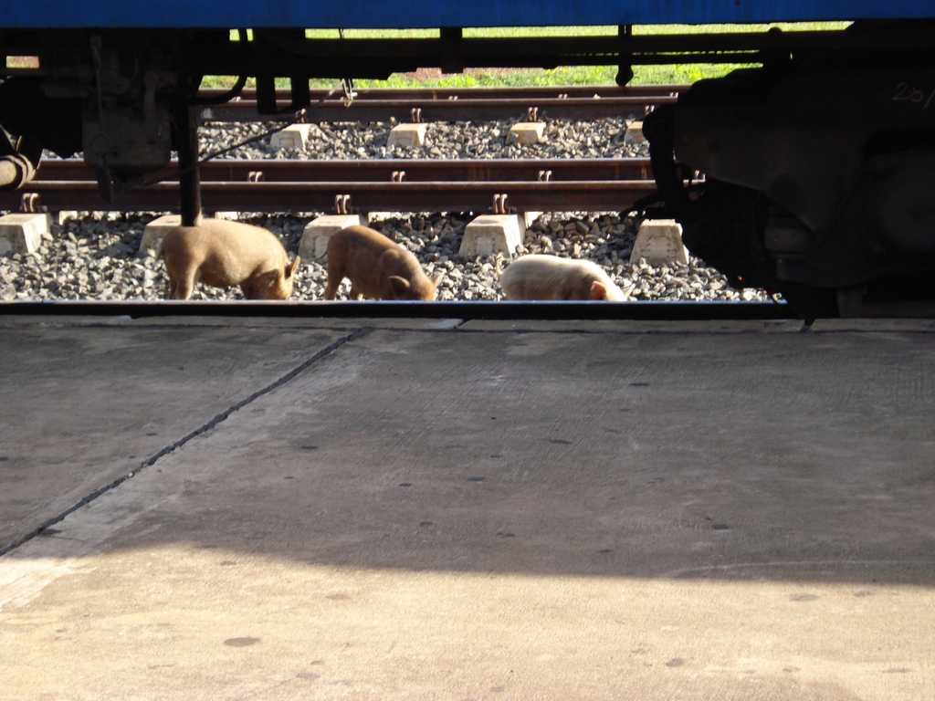 Leaving Laos we (Peter, his girlfriend Song, and I) crossed the border into Thailand in the small city of Nongkhai. We had to wait a couple hours for our train to leave to take us back to Bangkok. I was rather amused by a group of small pigs that trotted right up to the train and started digging their snouts in the gravel next to the tracks. Apparently as a city boy I'm rather easily amused by such things.